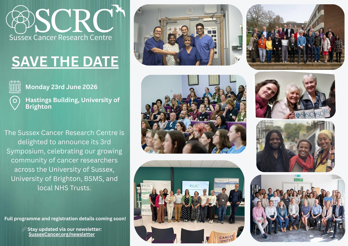 The Sussex Cancer Research Centre (SCRC) is delighted to announce its 3rd Symposium, celebrating our growing community of cancer researchers across the University of Sussex, University of Brighton, BSMS, and local NHS Trusts.